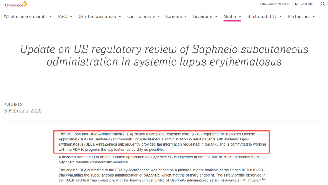 就在2026年2月,阿斯利康披露其Saphnelo(Anifrolumab,用于治疗成人SLE)皮下制剂的BLA收到了美国FDA的完全回复函(CRL),意味着该药的上市申请被拒了。奇怪的是,这个药在欧盟是获批的,而且III期临床数据是阳性的。虽然未官宣,但业界推测,FDA可能对亚组分析中的某些安全性信号或者制剂的稳定性产生了疑虑。