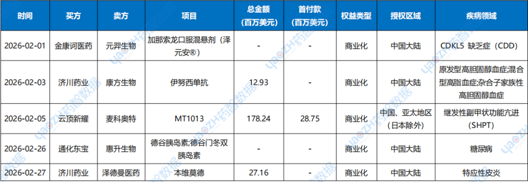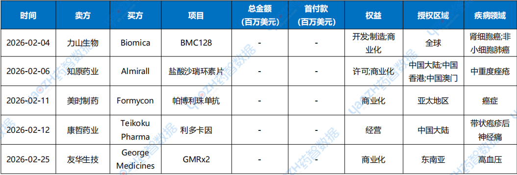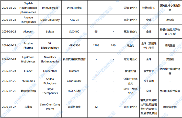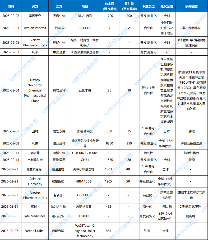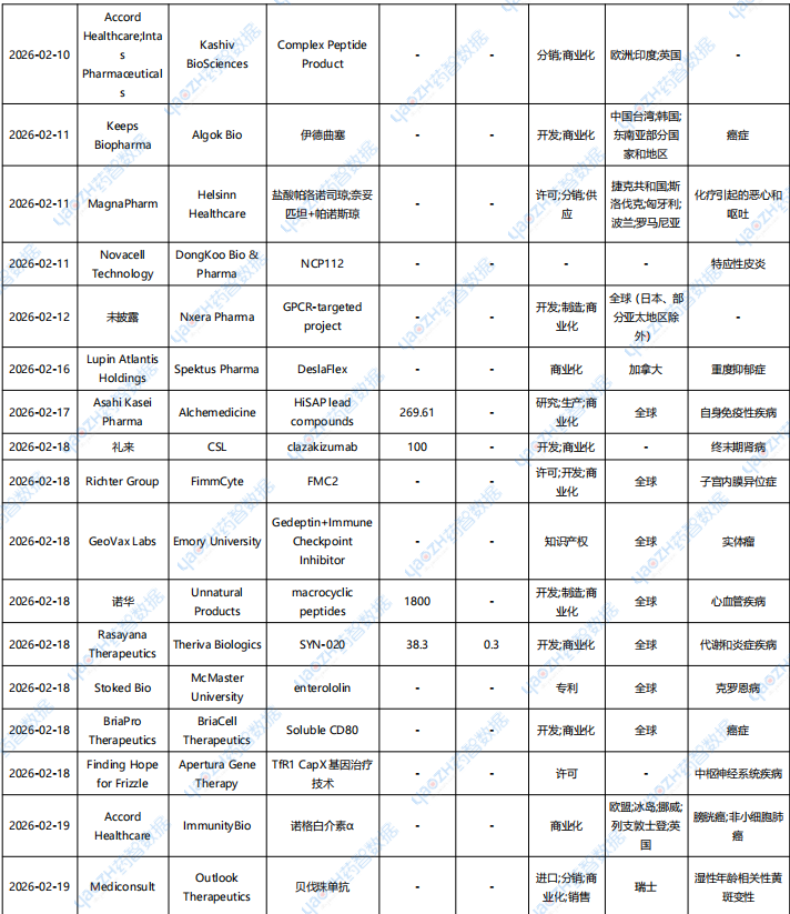 本月国内授权许可交易事件量共5项,交易总额最大的一项为云顶新耀引进麦科奥特临床三期资产MT1013中国及亚太区(日本除外)的独家商业化权益,根据协议,云顶新耀将向麦科奥特支付2亿元人民币的预付款,以及最高可达 10.4 亿元人民币的监管和商业里程碑付款。MT1013是全球首创的双靶向受体激动剂多肽,能同时靶向钙感应受体(CaSR)和成骨生长肽(OGP)受体,主要以继发性副甲亢(SHPT)为主要适应症开发,计划扩展至包括慢性肾病矿物质及骨质疾病(CKD-MBD)及骨质疏松和 SHPT未透析的适应症。MT1013于2025年5月完成了治疗SHPT的II期临床试验(MT1013-II-C01),并已进入以 Cinacalcet为主动对照剂的三期临床试验。国际市场上,本月共签署了91项资产授权和合作协议。其中授权许可交易有41项,最大的一笔授权许可交易是Unnatural Products与诺华达成一项未公开项目的研究合作和许可协议,此次合作结合了UNP的人工智能增强宏周期平台与诺华全球开发及商业化能力,旨在开发具有心血管疾病潜在应用的下一代治疗药物。根据协议条款,UNP将获得最高1亿美元的预付款和pre-IND里程碑付款,以及最高达17 亿美元的开发、监管和商业里程碑付款。2026年2月的医药交易画卷,在春节的余温中徐徐展开,又以密集落地的重磅合作惊艳收尾。从前沿生物牵手GSK实现小核酸管线的“十亿美元出海”,到和铂医药以“授权+股权”的NewCo模式开拓CTLA-4新蓝海,再到信达与礼来的再度深化、本土药企间的资源互补——这一月的每一笔交易,都在诉说着同一个事实:中国医药创新的价值锚点,正在发生深刻位移。