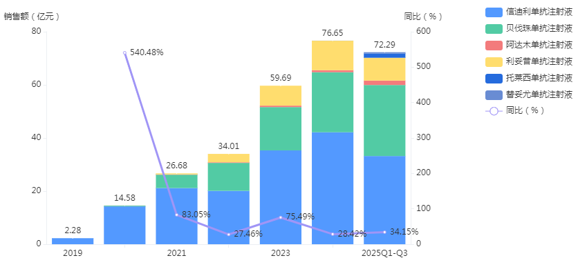 肿瘤、自免领域,PD-1单抗信迪利单抗每年贡献约40亿元的稳定现金流;多款生物类似药和新产品亦贡献显著收入增量。